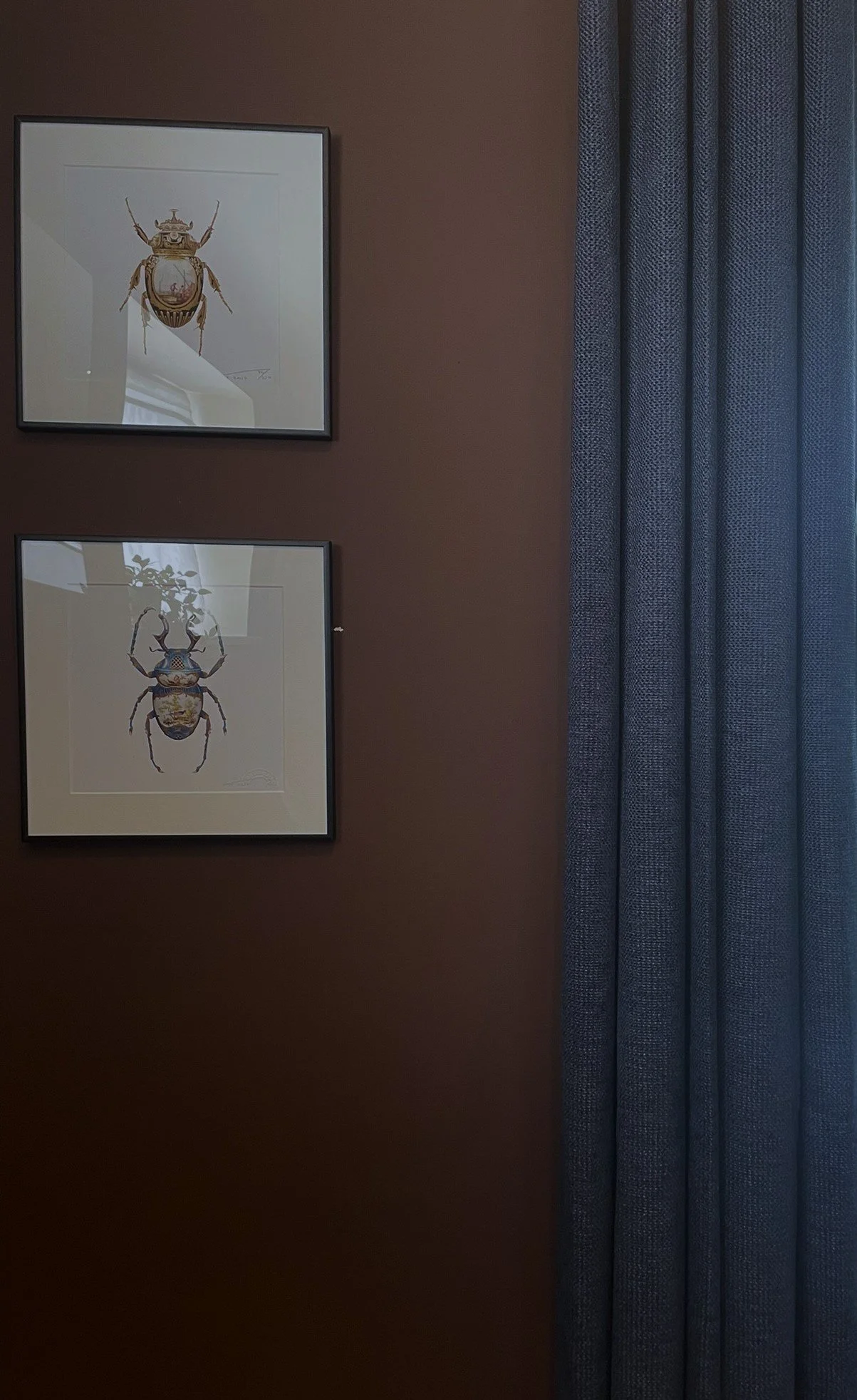 This study doubles up as an evening space, for enjoying a drink or taking some time out to read one of the many books within the large integrated storage media unit. Inspired by a whiskey lounge, the colour pallet of tan, chocolate and navy is sophisticated and cosy. Carefully curated to reflect the client’s personality, items which resonate and inspire are incorporated into the design. The space is layered with dark wood tones to create a cosy environment for study or relaxation.