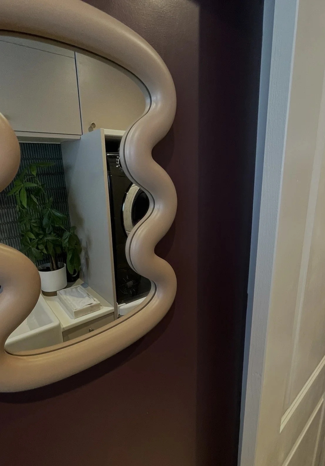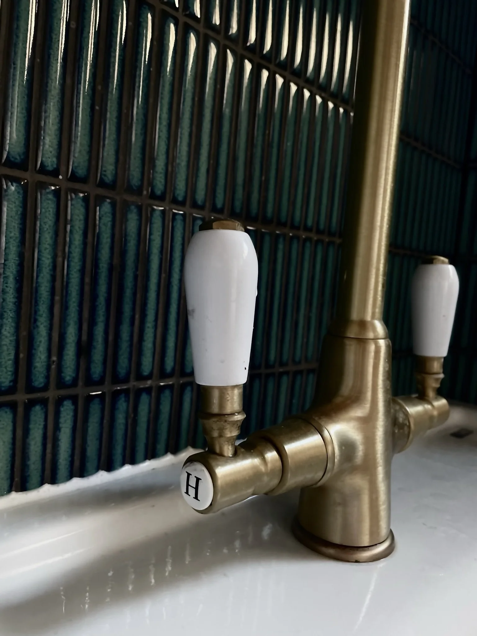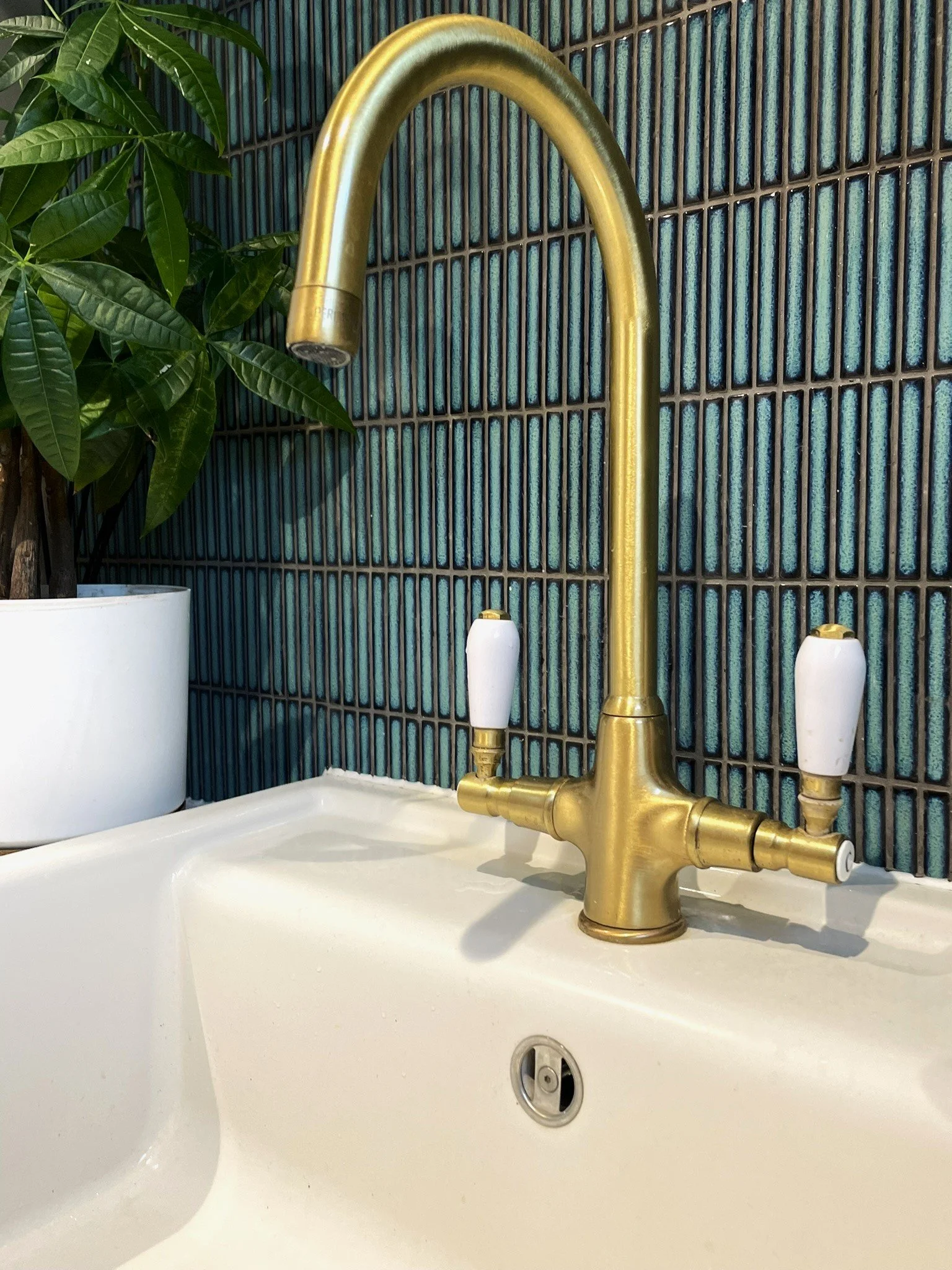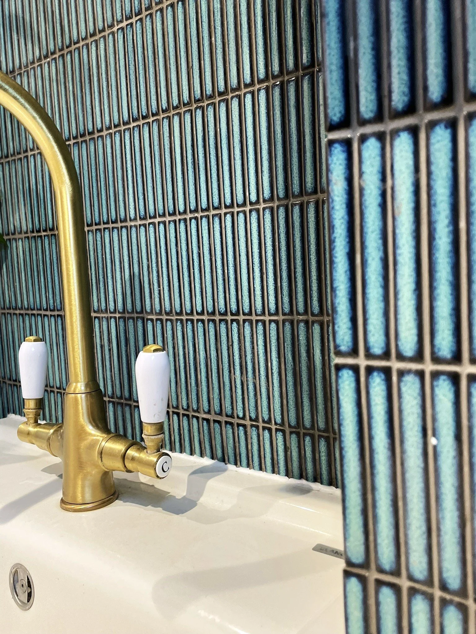 Highly functional, this space although small achieves a lot. Housing the boiler, washing machine, tumble drier and WC, the space works hard. Being such a small space, the bold colour was a playful choice and the contrast between the fresh turquoise, highly pigmented claret and soft cashmere create a perfect trio. Stunning texture is introduced through the tiled wall and the turquoise is mirrored through the artwork. The curve of the brass taps and feature mirror add balance, whilst the clean lines add a sleek finish to a beautiful, hardworking space.